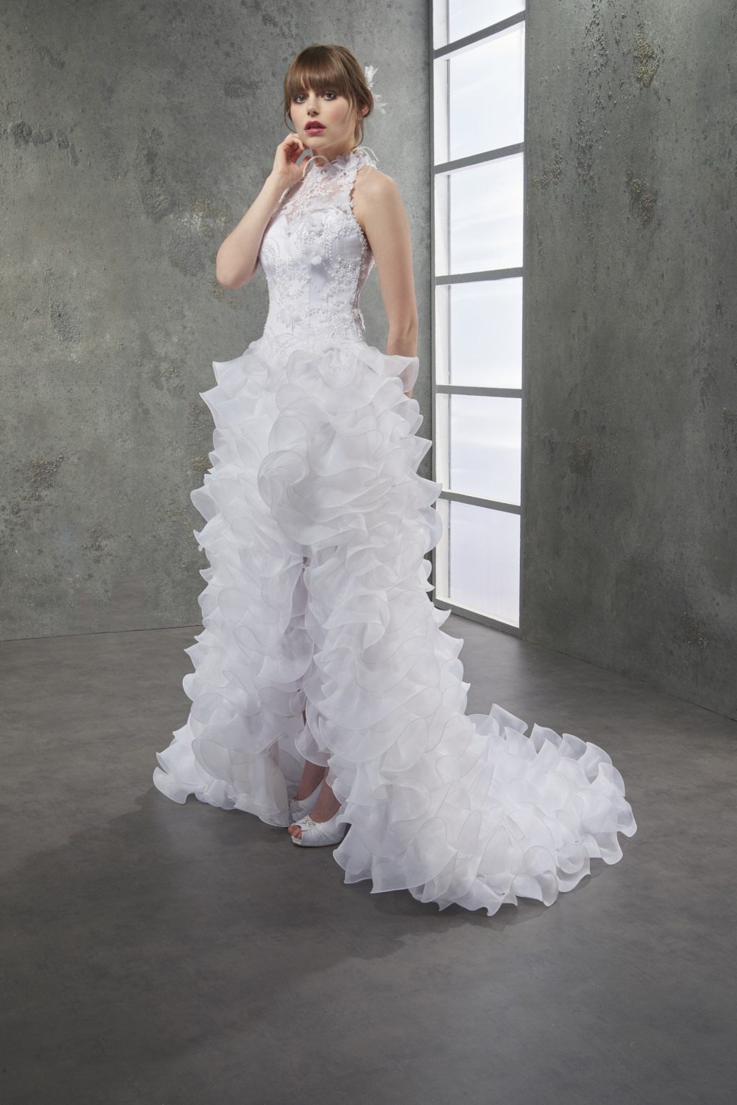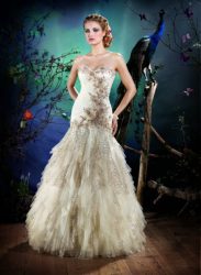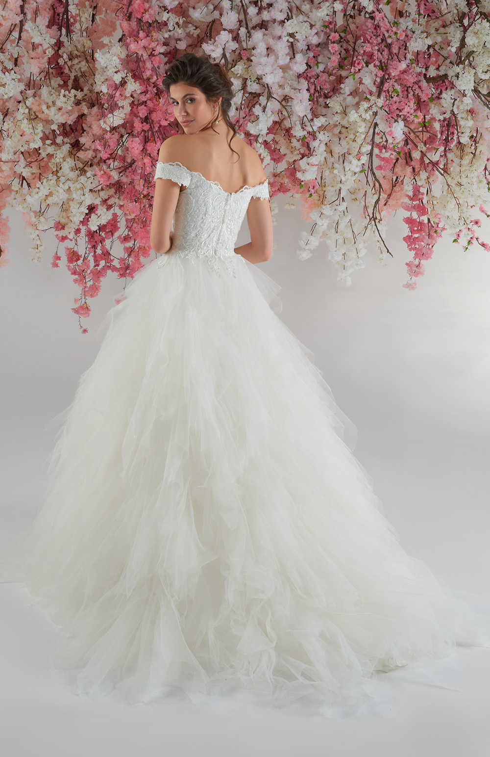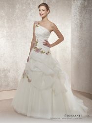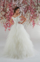Robe de mariage MAGNOLIA - Robe en Organza, orné de dentelle, de fleurs et de plumes. Cette robe se ferme avec un laçage dans le dos. Existe en d’autres couleurs