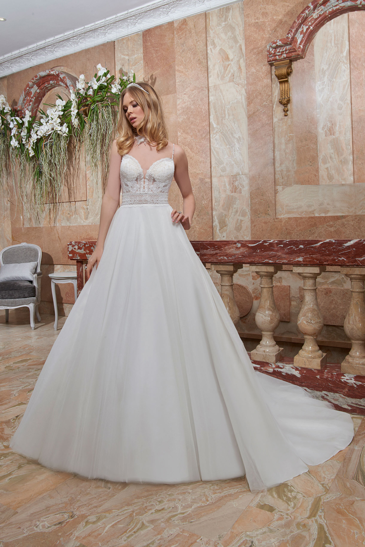 Robe de mariage MARINE - Robe en tulle, orné de dentelle. Son collier en dentelle assorti à la robe, fermeture à laçage dans le dos. Existe en d’autres couleurs